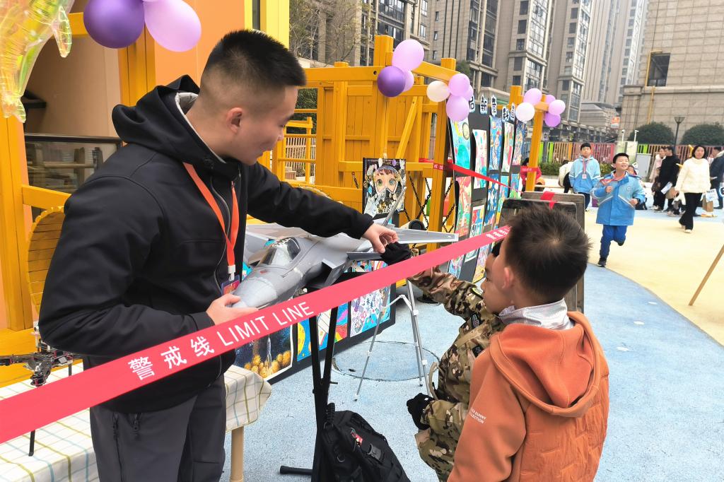 表演结束后,航模队队员带着多款精心挑选的航空模型,为孩子们开展沉浸式讲解展示,队员们用浅显易懂的语言,向孩子们介绍歼-20、翼龙Ⅱ、武直10等模型的构造、飞行原理,耐心解答孩子们“飞机为什么能飞上天”“航模怎么控制方向”等天马行空的问题。孩子们围在模型旁认真聆听、伸手触摸,在看一看、听一听、问一问中,对航空知识有了初步认知,心中的航空梦悄然萌芽。
